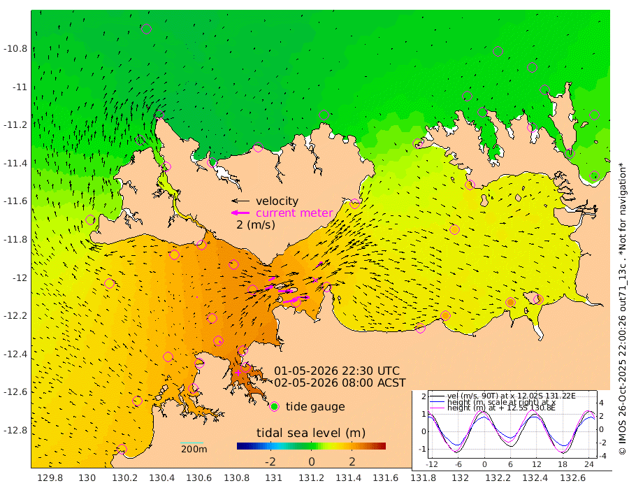 161cm/s 79T +4cm/s rms + 6cm/s 51T. Darwin_C1 52m 138cm/s 92T +4cm/s rms + 7cm/s -161T. Darwin_CW1 22m 94cm/s 71T +4cm/s rms + 8cm/s 61T. Darwin_CW2 34m 91cm/s 47T +3cm/s rms + 9cm/s 98T. Darwin_CW3 22m 159cm/s 90T +5cm/s rms + 7cm/s 88T. Darwin_C3 56m 76cm/s 65T +2cm/s rms + 9cm/s -126T. Darwin_CTbW 22m 11cm/s -18T +1cm/s rms + 1cm/s -47T. DARBGF 30m 26cm/s -41T +4cm/s rms + 3cm/s 80T. NRSDAR 19m -27cm Goodrich Bank 148cm Point Jenny 144cm Native Point 170cm Fish Reef 178cm Tapa Bay 63cm Point Fawcett (Offshore) 197cm Burge Point 163cm Munkunuwa 118cm Beagle A 194cm Parsons Bank 182cm Fenton Patches 200cm Hancox Shoal Area 204cm Nightcliff 227cm Darwin 196cm Charles Point Patches 187cm Glyde Point 186cm Chambers Bay 196cm Point Stuart 178cm Cape Hotham 167cm Christine Reef 216cm West Alligator Head 217cm East Field Island 160cm Two Hills Bay 149cm Camp Point 177cm Medina Inlet South 36cm South Barlow Point 13cm St. Asaph Bay -26cm Cape Van Dieman -20cm Snake Bay -15cm Cache Point 9cm Point Jahleel (Off) 65cm Cape Don 13cm Port Essington 11cm Smith Point - West 7cm NW Peacock Island -3cm North Of Jones Shoal 0cm Peacock Island 29cm Point David 10cm D'urville Point 33cm Copeland Island 30cm One Tree Point