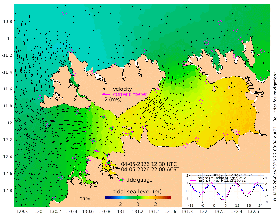 39cm/s 83T +4cm/s rms + 6cm/s 51T. Darwin_C1 52m 43cm/s 90T +4cm/s rms + 7cm/s -161T. Darwin_CW1 22m 4cm/s 21T +4cm/s rms + 8cm/s 61T. Darwin_CW2 34m 46cm/s 44T +3cm/s rms + 9cm/s 98T. Darwin_CW3 22m 28cm/s 94T +5cm/s rms + 7cm/s 88T. Darwin_C3 56m 9cm/s 66T +2cm/s rms + 9cm/s -126T. Darwin_CTbW 22m 63cm/s -85T +1cm/s rms + 1cm/s -47T. DARBGF 30m 78cm/s -54T +4cm/s rms + 3cm/s 80T. NRSDAR 19m -115cm Goodrich Bank -74cm Point Jenny -79cm Native Point -54cm Fish Reef -59cm Tapa Bay -115cm Point Fawcett (Offshore) -41cm Burge Point -63cm Munkunuwa -95cm Beagle A -18cm Parsons Bank -49cm Fenton Patches -8cm Hancox Shoal Area -27cm Nightcliff -4cm Darwin -38cm Charles Point Patches 43cm Glyde Point 112cm Chambers Bay 143cm Point Stuart 68cm Cape Hotham 91cm Christine Reef 165cm West Alligator Head 194cm East Field Island 86cm Two Hills Bay 69cm Camp Point -50cm Medina Inlet South -115cm South Barlow Point -127cm St. Asaph Bay -119cm Cape Van Dieman -112cm Snake Bay -108cm Cache Point -81cm Point Jahleel (Off) -22cm Cape Don -60cm Port Essington -66cm Smith Point - West -58cm NW Peacock Island -74cm North Of Jones Shoal -22cm Peacock Island -12cm Point David -55cm D'urville Point -4cm Copeland Island -15cm One Tree Point