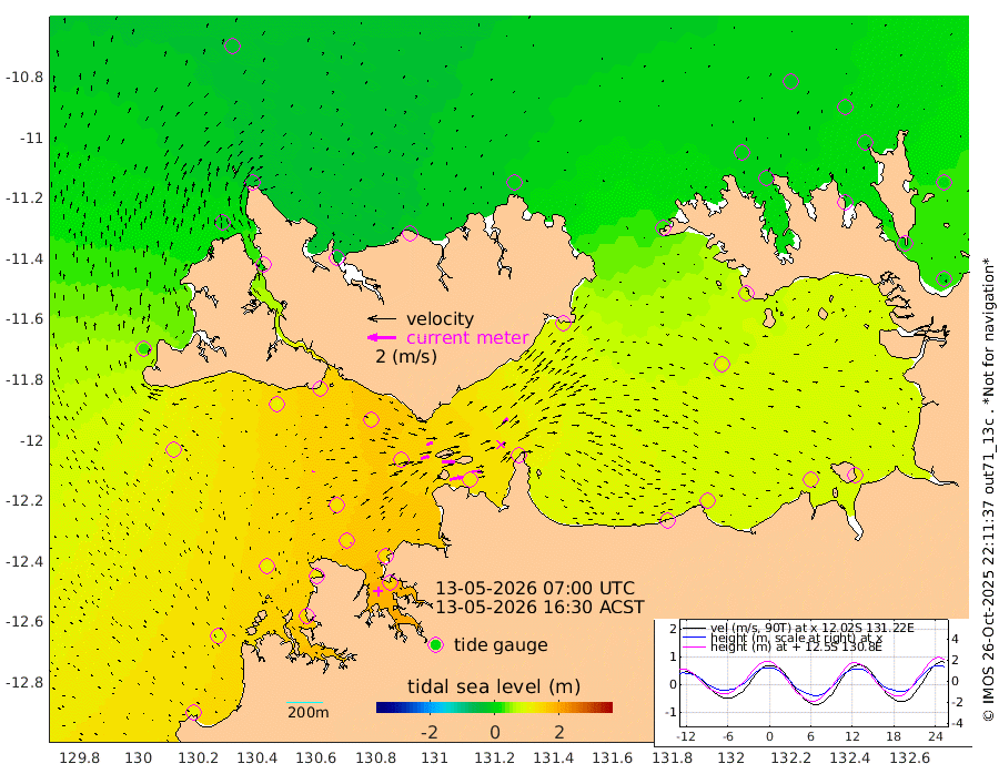 88cm/s 78T +4cm/s rms + 6cm/s 51T. Darwin_C1 52m 66cm/s 93T +4cm/s rms + 7cm/s -161T. Darwin_CW1 22m 58cm/s 72T +4cm/s rms + 8cm/s 61T. Darwin_CW2 34m 58cm/s 44T +3cm/s rms + 9cm/s 98T. Darwin_CW3 22m 92cm/s 90T +5cm/s rms + 7cm/s 88T. Darwin_C3 56m 46cm/s 66T +2cm/s rms + 9cm/s -126T. Darwin_CTbW 22m 6cm/s 29T +1cm/s rms + 1cm/s -47T. DARBGF 30m 6cm/s 17T +4cm/s rms + 3cm/s 80T. NRSDAR 19m -31cm Goodrich Bank 101cm Point Jenny 101cm Native Point 108cm Fish Reef 119cm Tapa Bay 26cm Point Fawcett (Offshore) 139cm Burge Point 107cm Munkunuwa 84cm Beagle A 128cm Parsons Bank 132cm Fenton Patches 130cm Hancox Shoal Area 146cm Nightcliff 151cm Darwin 126cm Charles Point Patches 120cm Glyde Point 111cm Chambers Bay 109cm Point Stuart 103cm Cape Hotham 102cm Christine Reef 119cm West Alligator Head 120cm East Field Island 86cm Two Hills Bay 96cm Camp Point 117cm Medina Inlet South 18cm South Barlow Point -4cm St. Asaph Bay -30cm Cape Van Dieman -23cm Snake Bay -28cm Cache Point -11cm Point Jahleel (Off) 32cm Cape Don -7cm Port Essington -10cm Smith Point - West -11cm NW Peacock Island -21cm North Of Jones Shoal -6cm Peacock Island 9cm Point David -8cm D'urville Point 10cm Copeland Island 8cm One Tree Point