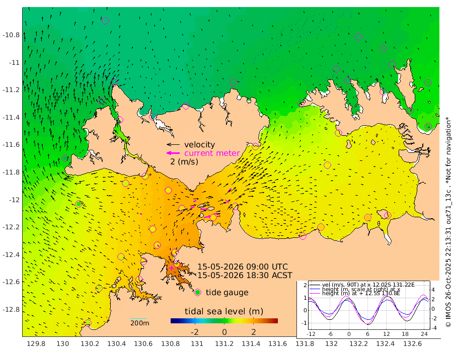 105cm/s 79T +4cm/s rms + 6cm/s 51T. Darwin_C1 52m 87cm/s 93T +4cm/s rms + 7cm/s -161T. Darwin_CW1 22m 57cm/s 70T +4cm/s rms + 8cm/s 61T. Darwin_CW2 34m 76cm/s 43T +3cm/s rms + 9cm/s 98T. Darwin_CW3 22m 101cm/s 90T +5cm/s rms + 7cm/s 88T. Darwin_C3 56m 46cm/s 65T +2cm/s rms + 9cm/s -126T. Darwin_CTbW 22m 27cm/s -75T +1cm/s rms + 1cm/s -47T. DARBGF 30m 37cm/s -47T +4cm/s rms + 3cm/s 80T. NRSDAR 19m -84cm Goodrich Bank 58cm Point Jenny 58cm Native Point 71cm Fish Reef 87cm Tapa Bay -35cm Point Fawcett (Offshore) 112cm Burge Point 78cm Munkunuwa 31cm Beagle A 116cm Parsons Bank 101cm Fenton Patches 121cm Hancox Shoal Area 124cm Nightcliff 141cm Darwin 101cm Charles Point Patches 125cm Glyde Point 134cm Chambers Bay 147cm Point Stuart 117cm Cape Hotham 121cm Christine Reef 164cm West Alligator Head 175cm East Field Island 104cm Two Hills Bay 110cm Camp Point 86cm Medina Inlet South -36cm South Barlow Point -65cm St. Asaph Bay -84cm Cape Van Dieman -74cm Snake Bay -81cm Cache Point -51cm Point Jahleel (Off) 10cm Cape Don -40cm Port Essington -45cm Smith Point - West -42cm NW Peacock Island -62cm North Of Jones Shoal -19cm Peacock Island 2cm Point David -37cm D'urville Point 7cm Copeland Island -6cm One Tree Point