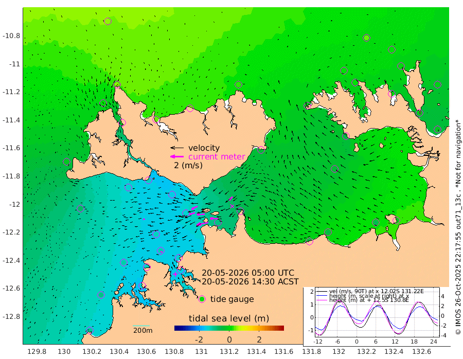 181cm/s -102T +4cm/s rms + 6cm/s 51T. Darwin_C1 52m 130cm/s -90T +4cm/s rms + 7cm/s -161T. Darwin_CW1 22m 89cm/s -107T +4cm/s rms + 8cm/s 61T. Darwin_CW2 34m 76cm/s -132T +3cm/s rms + 9cm/s 98T. Darwin_CW3 22m 121cm/s -91T +5cm/s rms + 7cm/s 88T. Darwin_C3 56m 101cm/s -115T +2cm/s rms + 9cm/s -126T. Darwin_CTbW 22m 33cm/s -95T +1cm/s rms + 1cm/s -47T. DARBGF 30m 29cm/s -76T +4cm/s rms + 3cm/s 80T. NRSDAR 19m 55cm Goodrich Bank -102cm Point Jenny -101cm Native Point -117cm Fish Reef -126cm Tapa Bay -21cm Point Fawcett (Offshore) -136cm Burge Point -140cm Munkunuwa -76cm Beagle A -153cm Parsons Bank -128cm Fenton Patches -141cm Hancox Shoal Area -144cm Nightcliff -153cm Darwin -122cm Charles Point Patches -94cm Glyde Point -50cm Chambers Bay -52cm Point Stuart -76cm Cape Hotham -44cm Christine Reef -58cm West Alligator Head -32cm East Field Island -50cm Two Hills Bay -34cm Camp Point -124cm Medina Inlet South -17cm South Barlow Point 15cm St. Asaph Bay 48cm Cape Van Dieman 42cm Snake Bay 49cm Cache Point 27cm Point Jahleel (Off) -12cm Cape Don 16cm Port Essington 11cm Smith Point - West 16cm NW Peacock Island 38cm North Of Jones Shoal 11cm Peacock Island -9cm Point David 6cm D'urville Point -15cm Copeland Island -1cm One Tree Point