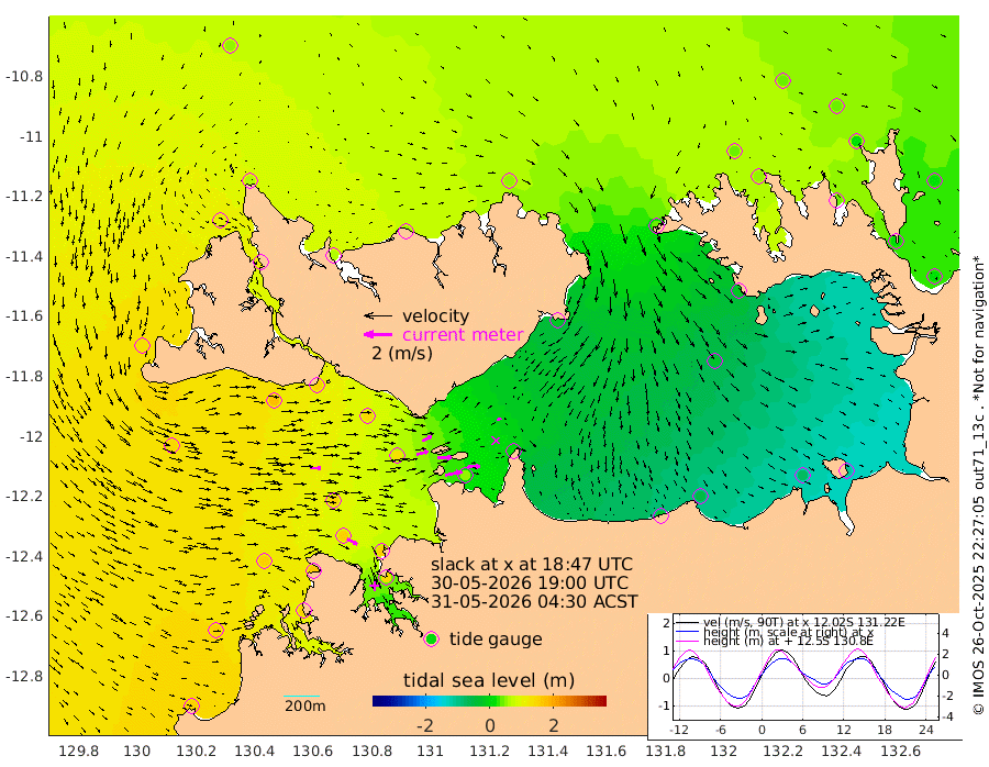 119cm/s 77T +4cm/s rms + 6cm/s 51T. Darwin_C1 52m 92cm/s 88T +4cm/s rms + 7cm/s -161T. Darwin_CW1 22m 82cm/s 75T +4cm/s rms + 8cm/s 61T. Darwin_CW2 34m 31cm/s 64T +3cm/s rms + 9cm/s 98T. Darwin_CW3 22m 103cm/s 87T +5cm/s rms + 7cm/s 88T. Darwin_C3 56m 76cm/s 64T +2cm/s rms + 9cm/s -126T. Darwin_CTbW 22m 77cm/s 90T +1cm/s rms + 1cm/s -47T. DARBGF 30m 78cm/s 119T +4cm/s rms + 3cm/s 80T. NRSDAR 19m 54cm Goodrich Bank 157cm Point Jenny 157cm Native Point 155cm Fish Reef 165cm Tapa Bay 129cm Point Fawcett (Offshore) 147cm Burge Point 169cm Munkunuwa 146cm Beagle A 143cm Parsons Bank 150cm Fenton Patches 134cm Hancox Shoal Area 157cm Nightcliff 143cm Darwin 150cm Charles Point Patches 56cm Glyde Point -24cm Chambers Bay -56cm Point Stuart 20cm Cape Hotham -23cm Christine Reef -68cm West Alligator Head -110cm East Field Island -14cm Two Hills Bay -12cm Camp Point 157cm Medina Inlet South 115cm South Barlow Point 103cm St. Asaph Bay 62cm Cape Van Dieman 61cm Snake Bay 55cm Cache Point 51cm Point Jahleel (Off) 40cm Cape Don 43cm Port Essington 52cm Smith Point - West 39cm NW Peacock Island 43cm North Of Jones Shoal 14cm Peacock Island 20cm Point David 45cm D'urville Point 18cm Copeland Island 22cm One Tree Point