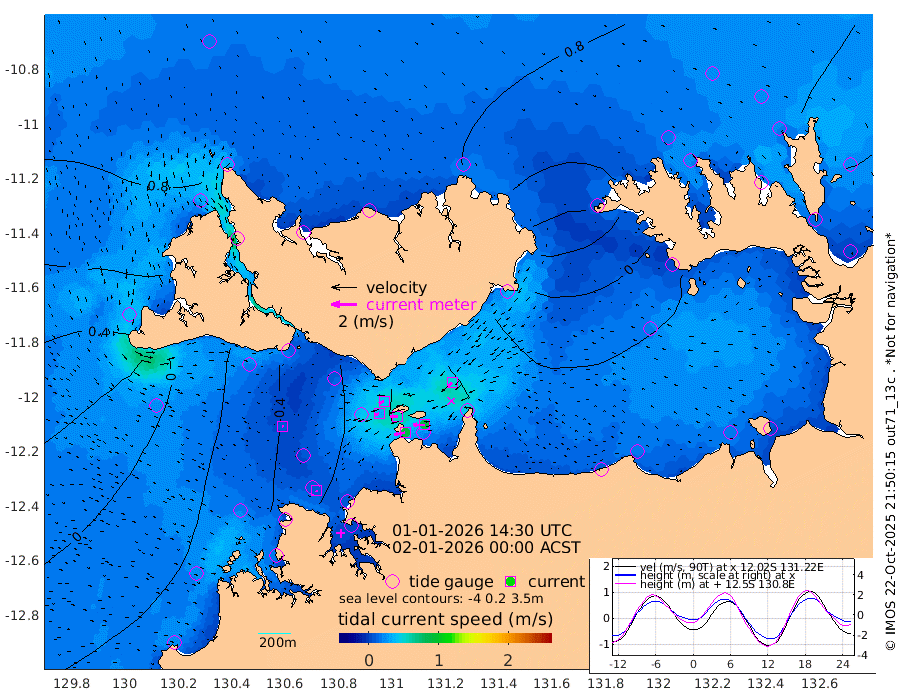 87cm/s -101T +4cm/s rms + 6cm/s 51T. Darwin_C1 52m 89cm/s -90T +4cm/s rms + 7cm/s -161T. Darwin_CW1 22m 33cm/s -108T +4cm/s rms + 8cm/s 61T. Darwin_CW2 34m 50cm/s -135T +3cm/s rms + 9cm/s 98T. Darwin_CW3 22m 57cm/s -91T +5cm/s rms + 7cm/s 88T. Darwin_C3 56m 41cm/s -115T +2cm/s rms + 9cm/s -126T. Darwin_CTbW 22m 9cm/s 110T +1cm/s rms + 1cm/s -47T. DARBGF 30m 10cm/s 151T +4cm/s rms + 3cm/s 80T. NRSDAR 19m 89cm Goodrich Bank -24cm Point Jenny -22cm Native Point -26cm Fish Reef -38cm Tapa Bay 45cm Point Fawcett (Offshore) -49cm Burge Point -43cm Munkunuwa -1cm Beagle A -51cm Parsons Bank -44cm Fenton Patches -56cm Hancox Shoal Area -61cm Nightcliff -54cm Darwin -28cm Charles Point Patches -46cm Glyde Point -56cm Chambers Bay -61cm Point Stuart -43cm Cape Hotham -52cm Christine Reef -74cm West Alligator Head -75cm East Field Island -32cm Two Hills Bay -32cm Camp Point -30cm Medina Inlet South 54cm South Barlow Point 66cm St. Asaph Bay 88cm Cape Van Dieman 90cm Snake Bay 87cm Cache Point 67cm Point Jahleel (Off) 31cm Cape Don 66cm Port Essington 65cm Smith Point - West 68cm NW Peacock Island 79cm North Of Jones Shoal 26cm Peacock Island 47cm Point David 64cm D'urville Point 40cm Copeland Island 53cm One Tree Point
