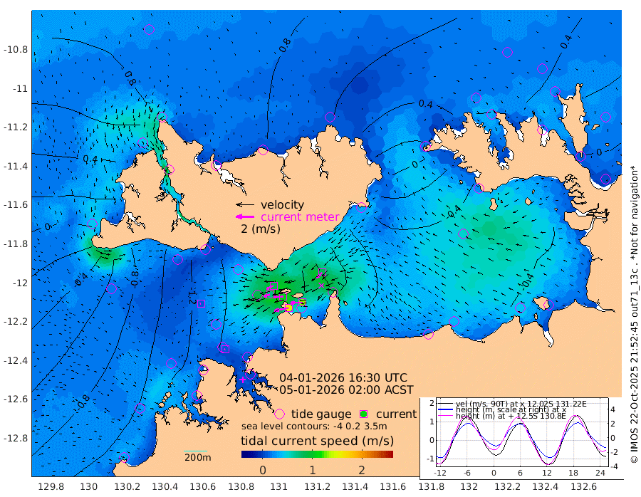 160cm/s -101T +4cm/s rms + 6cm/s 51T. Darwin_C1 52m 131cm/s -91T +4cm/s rms + 7cm/s -161T. Darwin_CW1 22m 69cm/s -107T +4cm/s rms + 8cm/s 61T. Darwin_CW2 34m 85cm/s -135T +3cm/s rms + 9cm/s 98T. Darwin_CW3 22m 106cm/s -91T +5cm/s rms + 7cm/s 88T. Darwin_C3 56m 84cm/s -116T +2cm/s rms + 9cm/s -126T. Darwin_CTbW 22m 9cm/s -122T +1cm/s rms + 1cm/s -47T. DARBGF 30m 10cm/s -116T +4cm/s rms + 3cm/s 80T. NRSDAR 19m 79cm Goodrich Bank -93cm Point Jenny -90cm Native Point -108cm Fish Reef -117cm Tapa Bay 4cm Point Fawcett (Offshore) -134cm Burge Point -121cm Munkunuwa -68cm Beagle A -140cm Parsons Bank -130cm Fenton Patches -138cm Hancox Shoal Area -143cm Nightcliff -149cm Darwin -114cm Charles Point Patches -111cm Glyde Point -98cm Chambers Bay -102cm Point Stuart -99cm Cape Hotham -87cm Christine Reef -116cm West Alligator Head -108cm East Field Island -76cm Two Hills Bay -67cm Camp Point -111cm Medina Inlet South 14cm South Barlow Point 41cm St. Asaph Bay 75cm Cape Van Dieman 73cm Snake Bay 72cm Cache Point 46cm Point Jahleel (Off) -2cm Cape Don 42cm Port Essington 38cm Smith Point - West 42cm NW Peacock Island 64cm North Of Jones Shoal 20cm Peacock Island 18cm Point David 35cm D'urville Point 11cm Copeland Island 25cm One Tree Point
