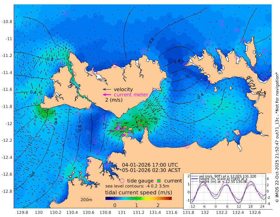 129cm/s -101T +4cm/s rms + 6cm/s 51T. Darwin_C1 52m 112cm/s -91T +4cm/s rms + 7cm/s -161T. Darwin_CW1 22m 55cm/s -107T +4cm/s rms + 8cm/s 61T. Darwin_CW2 34m 82cm/s -136T +3cm/s rms + 9cm/s 98T. Darwin_CW3 22m 93cm/s -91T +5cm/s rms + 7cm/s 88T. Darwin_C3 56m 62cm/s -116T +2cm/s rms + 9cm/s -126T. Darwin_CTbW 22m 13cm/s 116T +1cm/s rms + 1cm/s -47T. DARBGF 30m 17cm/s 153T +4cm/s rms + 3cm/s 80T. NRSDAR 19m 91cm Goodrich Bank -63cm Point Jenny -60cm Native Point -76cm Fish Reef -86cm Tapa Bay 30cm Point Fawcett (Offshore) -105cm Burge Point -88cm Munkunuwa -39cm Beagle A -110cm Parsons Bank -102cm Fenton Patches -113cm Hancox Shoal Area -115cm Nightcliff -121cm Darwin -84cm Charles Point Patches -102cm Glyde Point -111cm Chambers Bay -117cm Point Stuart -96cm Cape Hotham -98cm Christine Reef -135cm West Alligator Head -138cm East Field Island -80cm Two Hills Bay -72cm Camp Point -80cm Medina Inlet South 40cm South Barlow Point 62cm St. Asaph Bay 91cm Cape Van Dieman 90cm Snake Bay 86cm Cache Point 59cm Point Jahleel (Off) 10cm Cape Don 57cm Port Essington 54cm Smith Point - West 57cm NW Peacock Island 78cm North Of Jones Shoal 25cm Peacock Island 33cm Point David 52cm D'urville Point 26cm Copeland Island 40cm One Tree Point