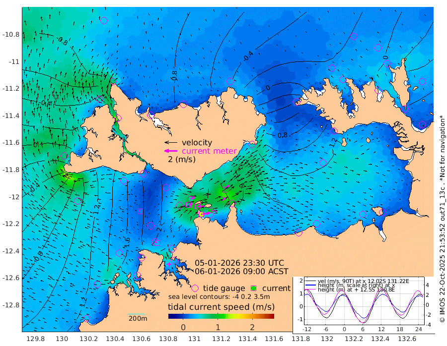 140cm/s 79T +4cm/s rms + 6cm/s 51T. Darwin_C1 52m 100cm/s 92T +4cm/s rms + 7cm/s -161T. Darwin_CW1 22m 67cm/s 69T +4cm/s rms + 8cm/s 61T. Darwin_CW2 34m 93cm/s 44T +3cm/s rms + 9cm/s 98T. Darwin_CW3 22m 102cm/s 89T +5cm/s rms + 7cm/s 88T. Darwin_C3 56m 66cm/s 65T +2cm/s rms + 9cm/s -126T. Darwin_CTbW 22m 21cm/s -72T +1cm/s rms + 1cm/s -47T. DARBGF 30m 35cm/s -48T +4cm/s rms + 3cm/s 80T. NRSDAR 19m -80cm Goodrich Bank 80cm Point Jenny 76cm Native Point 100cm Fish Reef 110cm Tapa Bay -16cm Point Fawcett (Offshore) 132cm Burge Point 96cm Munkunuwa 46cm Beagle A 149cm Parsons Bank 119cm Fenton Patches 152cm Hancox Shoal Area 140cm Nightcliff 168cm Darwin 131cm Charles Point Patches 147cm Glyde Point 159cm Chambers Bay 173cm Point Stuart 145cm Cape Hotham 137cm Christine Reef 188cm West Alligator Head 193cm East Field Island 132cm Two Hills Bay 122cm Camp Point 107cm Medina Inlet South -25cm South Barlow Point -57cm St. Asaph Bay -77cm Cape Van Dieman -69cm Snake Bay -67cm Cache Point -37cm Point Jahleel (Off) 37cm Cape Don -10cm Port Essington -13cm Smith Point - West -8cm NW Peacock Island -39cm North Of Jones Shoal -9cm Peacock Island 47cm Point David 0cm D'urville Point 56cm Copeland Island 37cm One Tree Point