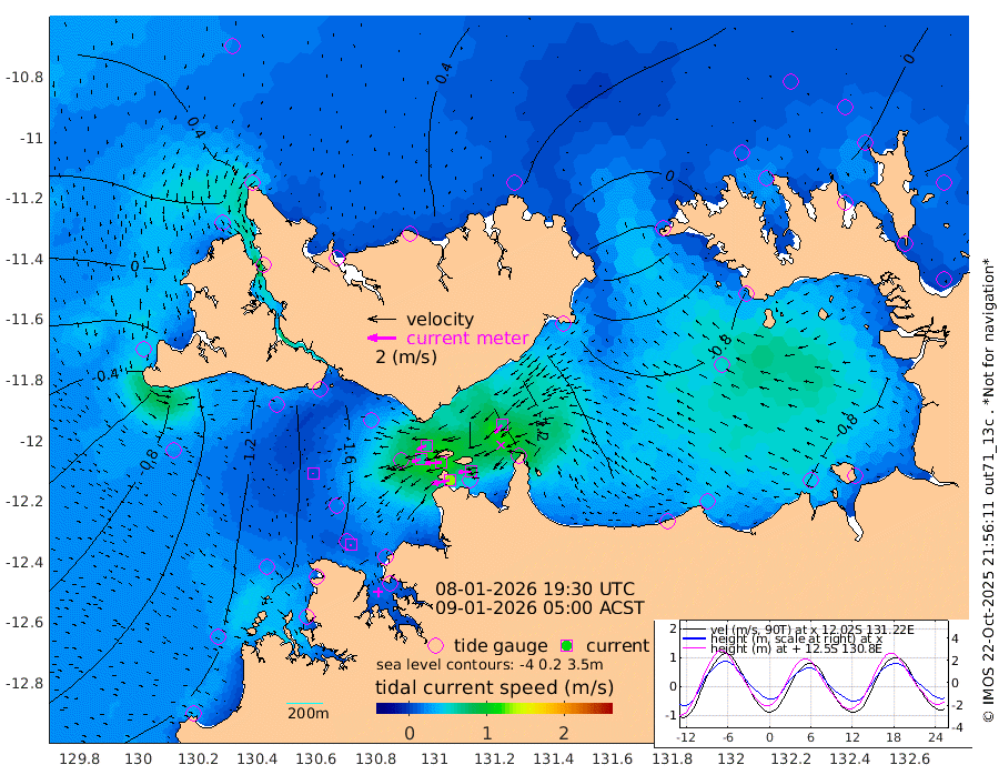 130cm/s -101T +4cm/s rms + 6cm/s 51T. Darwin_C1 52m 88cm/s -92T +4cm/s rms + 7cm/s -161T. Darwin_CW1 22m 64cm/s -106T +4cm/s rms + 8cm/s 61T. Darwin_CW2 34m 76cm/s -136T +3cm/s rms + 9cm/s 98T. Darwin_CW3 22m 111cm/s -91T +5cm/s rms + 7cm/s 88T. Darwin_C3 56m 69cm/s -116T +2cm/s rms + 9cm/s -126T. Darwin_CTbW 22m 6cm/s -172T +1cm/s rms + 1cm/s -47T. DARBGF 30m 10cm/s 176T +4cm/s rms + 3cm/s 80T. NRSDAR 19m 39cm Goodrich Bank -112cm Point Jenny -107cm Native Point -133cm Fish Reef -131cm Tapa Bay -33cm Point Fawcett (Offshore) -152cm Burge Point -122cm Munkunuwa -93cm Beagle A -156cm Parsons Bank -148cm Fenton Patches -156cm Hancox Shoal Area -160cm Nightcliff -174cm Darwin -143cm Charles Point Patches -147cm Glyde Point -154cm Chambers Bay -157cm Point Stuart -141cm Cape Hotham -135cm Christine Reef -174cm West Alligator Head -174cm East Field Island -129cm Two Hills Bay -110cm Camp Point -132cm Medina Inlet South -17cm South Barlow Point 7cm St. Asaph Bay 38cm Cape Van Dieman 33cm Snake Bay 27cm Cache Point 4cm Point Jahleel (Off) -49cm Cape Don -4cm Port Essington -8cm Smith Point - West -5cm NW Peacock Island 12cm North Of Jones Shoal 2cm Peacock Island -23cm Point David -11cm D'urville Point -29cm Copeland Island -24cm One Tree Point