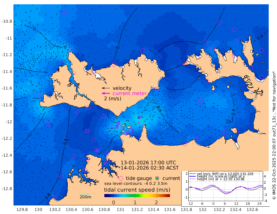 40cm/s 78T +4cm/s rms + 6cm/s 51T. Darwin_C1 52m 32cm/s 85T +4cm/s rms + 7cm/s -161T. Darwin_CW1 22m 22cm/s 74T +4cm/s rms + 8cm/s 61T. Darwin_CW2 34m 24cm/s 45T +3cm/s rms + 9cm/s 98T. Darwin_CW3 22m 44cm/s 90T +5cm/s rms + 7cm/s 88T. Darwin_C3 56m 25cm/s 64T +2cm/s rms + 9cm/s -126T. Darwin_CTbW 22m 7cm/s -68T +1cm/s rms + 1cm/s -47T. DARBGF 30m 12cm/s -42T +4cm/s rms + 3cm/s 80T. NRSDAR 19m -19cm Goodrich Bank 34cm Point Jenny 32cm Native Point 47cm Fish Reef 40cm Tapa Bay 6cm Point Fawcett (Offshore) 51cm Burge Point 29cm Munkunuwa 26cm Beagle A 55cm Parsons Bank 49cm Fenton Patches 55cm Hancox Shoal Area 57cm Nightcliff 68cm Darwin 53cm Charles Point Patches 68cm Glyde Point 77cm Chambers Bay 87cm Point Stuart 68cm Cape Hotham 66cm Christine Reef 93cm West Alligator Head 99cm East Field Island 71cm Two Hills Bay 62cm Camp Point 46cm Medina Inlet South 1cm South Barlow Point -13cm St. Asaph Bay -18cm Cape Van Dieman -11cm Snake Bay -12cm Cache Point -1cm Point Jahleel (Off) 33cm Cape Don 13cm Port Essington 10cm Smith Point - West 12cm NW Peacock Island 4cm North Of Jones Shoal 4cm Peacock Island 33cm Point David 16cm D'urville Point 36cm Copeland Island 35cm One Tree Point