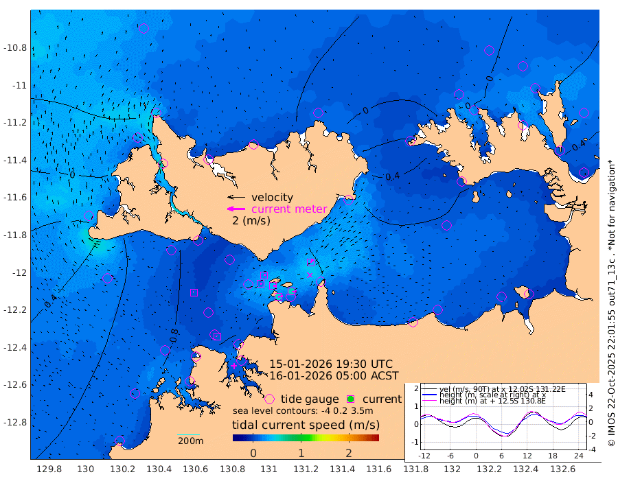 52cm/s 78T +4cm/s rms + 6cm/s 51T. Darwin_C1 52m 55cm/s 91T +4cm/s rms + 7cm/s -161T. Darwin_CW1 22m 19cm/s 71T +4cm/s rms + 8cm/s 61T. Darwin_CW2 34m 39cm/s 38T +3cm/s rms + 9cm/s 98T. Darwin_CW3 22m 38cm/s 90T +5cm/s rms + 7cm/s 88T. Darwin_C3 56m 22cm/s 66T +2cm/s rms + 9cm/s -126T. Darwin_CTbW 22m 7cm/s -76T +1cm/s rms + 1cm/s -47T. DARBGF 30m 9cm/s -46T +4cm/s rms + 3cm/s 80T. NRSDAR 19m -46cm Goodrich Bank 16cm Point Jenny 14cm Native Point 31cm Fish Reef 26cm Tapa Bay -17cm Point Fawcett (Offshore) 38cm Burge Point 20cm Munkunuwa 5cm Beagle A 43cm Parsons Bank 33cm Fenton Patches 43cm Hancox Shoal Area 45cm Nightcliff 56cm Darwin 39cm Charles Point Patches 54cm Glyde Point 58cm Chambers Bay 71cm Point Stuart 55cm Cape Hotham 45cm Christine Reef 77cm West Alligator Head 82cm East Field Island 52cm Two Hills Bay 48cm Camp Point 31cm Medina Inlet South -22cm South Barlow Point -37cm St. Asaph Bay -44cm Cape Van Dieman -37cm Snake Bay -39cm Cache Point -26cm Point Jahleel (Off) 10cm Cape Don -10cm Port Essington -15cm Smith Point - West -12cm NW Peacock Island -20cm North Of Jones Shoal -4cm Peacock Island 19cm Point David -8cm D'urville Point 23cm Copeland Island 17cm One Tree Point
