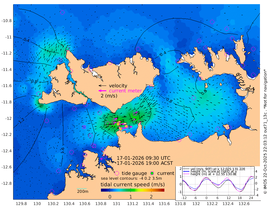 156cm/s 79T +4cm/s rms + 6cm/s 51T. Darwin_C1 52m 149cm/s 92T +4cm/s rms + 7cm/s -161T. Darwin_CW1 22m 92cm/s 71T +4cm/s rms + 8cm/s 61T. Darwin_CW2 34m 89cm/s 46T +3cm/s rms + 9cm/s 98T. Darwin_CW3 22m 145cm/s 90T +5cm/s rms + 7cm/s 88T. Darwin_C3 56m 80cm/s 66T +2cm/s rms + 9cm/s -126T. Darwin_CTbW 22m 21cm/s 69T +1cm/s rms + 1cm/s -47T. DARBGF 30m 7cm/s 76T +4cm/s rms + 3cm/s 80T. NRSDAR 19m 17cm Goodrich Bank 165cm Point Jenny 163cm Native Point 177cm Fish Reef 185cm Tapa Bay 97cm Point Fawcett (Offshore) 194cm Burge Point 165cm Munkunuwa 149cm Beagle A 177cm Parsons Bank 192cm Fenton Patches 183cm Hancox Shoal Area 199cm Nightcliff 210cm Darwin 197cm Charles Point Patches 161cm Glyde Point 140cm Chambers Bay 131cm Point Stuart 136cm Cape Hotham 127cm Christine Reef 142cm West Alligator Head 139cm East Field Island 115cm Two Hills Bay 119cm Camp Point 181cm Medina Inlet South 73cm South Barlow Point 57cm St. Asaph Bay 17cm Cape Van Dieman 19cm Snake Bay 23cm Cache Point 34cm Point Jahleel (Off) 66cm Cape Don 29cm Port Essington 29cm Smith Point - West 21cm NW Peacock Island 19cm North Of Jones Shoal 6cm Peacock Island 17cm Point David 22cm D'urville Point 17cm Copeland Island 22cm One Tree Point