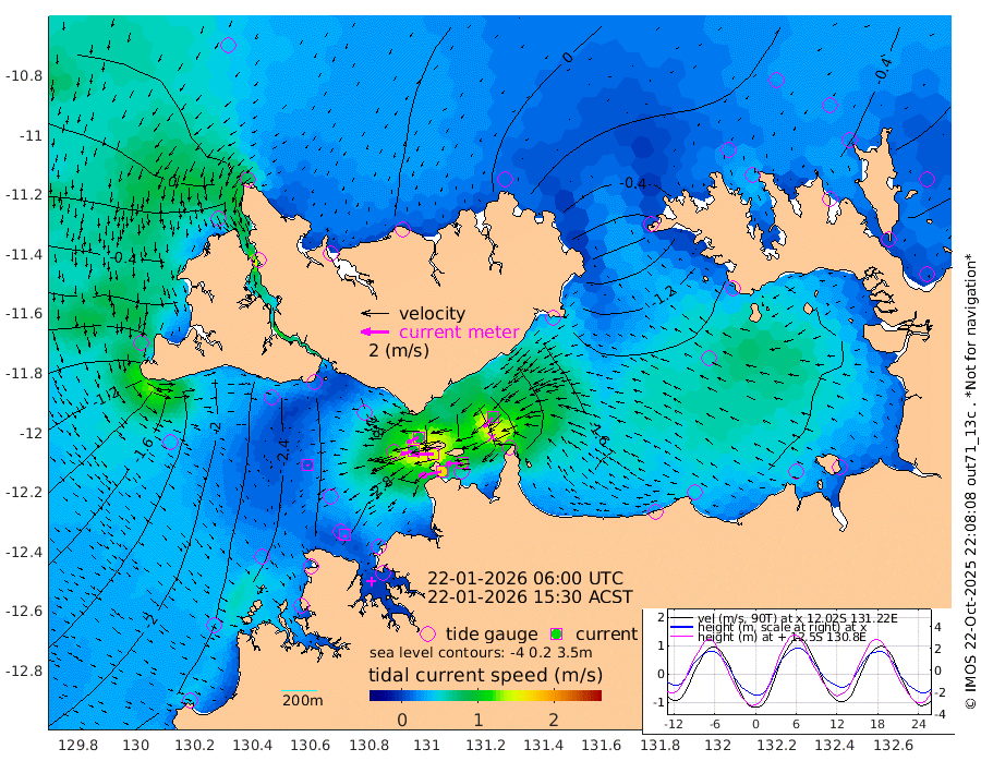 169cm/s -101T +4cm/s rms + 6cm/s 51T. Darwin_C1 52m 123cm/s -91T +4cm/s rms + 7cm/s -161T. Darwin_CW1 22m 88cm/s -106T +4cm/s rms + 8cm/s 61T. Darwin_CW2 34m 99cm/s -136T +3cm/s rms + 9cm/s 98T. Darwin_CW3 22m 149cm/s -90T +5cm/s rms + 7cm/s 88T. Darwin_C3 56m 92cm/s -115T +2cm/s rms + 9cm/s -126T. Darwin_CTbW 22m 9cm/s 161T +1cm/s rms + 1cm/s -47T. DARBGF 30m 18cm/s 161T +4cm/s rms + 3cm/s 80T. NRSDAR 19m 27cm Goodrich Bank -166cm Point Jenny -165cm Native Point -173cm Fish Reef -201cm Tapa Bay -54cm Point Fawcett (Offshore) -218cm Burge Point -174cm Munkunuwa -125cm Beagle A -222cm Parsons Bank -203cm Fenton Patches -230cm Hancox Shoal Area -231cm Nightcliff -256cm Darwin -224cm Charles Point Patches -204cm Glyde Point -199cm Chambers Bay -191cm Point Stuart -180cm Cape Hotham -181cm Christine Reef -206cm West Alligator Head -205cm East Field Island -159cm Two Hills Bay -167cm Camp Point -194cm Medina Inlet South -42cm South Barlow Point -7cm St. Asaph Bay 26cm Cape Van Dieman 16cm Snake Bay 19cm Cache Point -7cm Point Jahleel (Off) -78cm Cape Don -25cm Port Essington -21cm Smith Point - West -22cm NW Peacock Island 2cm North Of Jones Shoal -2cm Peacock Island -61cm Point David -28cm D'urville Point -64cm Copeland Island -55cm One Tree Point