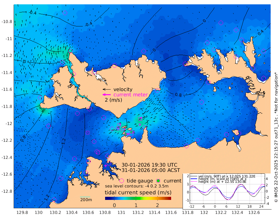 91cm/s 78T +4cm/s rms + 6cm/s 51T. Darwin_C1 52m 73cm/s 91T +4cm/s rms + 7cm/s -161T. Darwin_CW1 22m 34cm/s 72T +4cm/s rms + 8cm/s 61T. Darwin_CW2 34m 61cm/s 40T +3cm/s rms + 9cm/s 98T. Darwin_CW3 22m 52cm/s 90T +5cm/s rms + 7cm/s 88T. Darwin_C3 56m 44cm/s 64T +2cm/s rms + 9cm/s -126T. Darwin_CTbW 22m 4cm/s -47T +1cm/s rms + 1cm/s -47T. DARBGF 30m 5cm/s -16T +4cm/s rms + 3cm/s 80T. NRSDAR 19m -46cm Goodrich Bank 73cm Point Jenny 72cm Native Point 83cm Fish Reef 90cm Tapa Bay 1cm Point Fawcett (Offshore) 106cm Burge Point 74cm Munkunuwa 57cm Beagle A 109cm Parsons Bank 103cm Fenton Patches 109cm Hancox Shoal Area 106cm Nightcliff 119cm Darwin 96cm Charles Point Patches 104cm Glyde Point 96cm Chambers Bay 108cm Point Stuart 98cm Cape Hotham 87cm Christine Reef 115cm West Alligator Head 116cm East Field Island 83cm Two Hills Bay 84cm Camp Point 81cm Medina Inlet South -6cm South Barlow Point -29cm St. Asaph Bay -41cm Cape Van Dieman -37cm Snake Bay -37cm Cache Point -18cm Point Jahleel (Off) 29cm Cape Don 0cm Port Essington -2cm Smith Point - West 2cm NW Peacock Island -25cm North Of Jones Shoal -5cm Peacock Island 43cm Point David 9cm D'urville Point 48cm Copeland Island 31cm One Tree Point