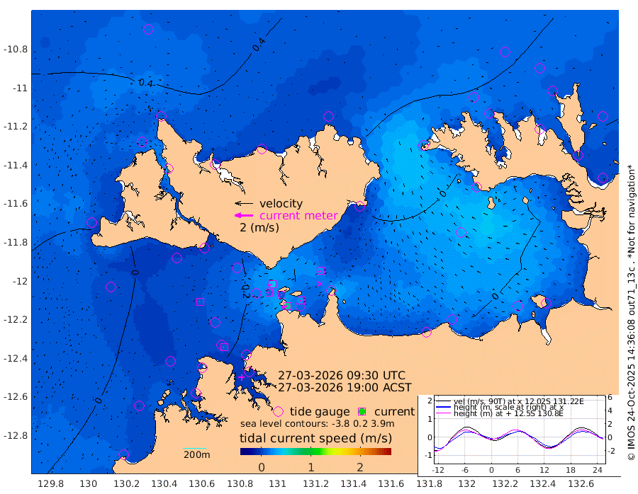 65cm/s -101T +4cm/s rms + 6cm/s 51T. Darwin_C1 52m 22cm/s -89T +4cm/s rms + 7cm/s -161T. Darwin_CW1 22m 16cm/s -111T +4cm/s rms + 8cm/s 61T. Darwin_CW2 34m 23cm/s -129T +3cm/s rms + 9cm/s 98T. Darwin_CW3 22m 9cm/s -94T +5cm/s rms + 7cm/s 88T. Darwin_C3 56m 44cm/s -116T +2cm/s rms + 9cm/s -126T. Darwin_CTbW 22m 7cm/s -85T +1cm/s rms + 1cm/s -47T. DARBGF 30m 9cm/s -70T +4cm/s rms + 3cm/s 80T. NRSDAR 19m 46cm Goodrich Bank 0cm Point Jenny 2cm Native Point -5cm Fish Reef -1cm Tapa Bay 25cm Point Fawcett (Offshore) 0cm Burge Point -7cm Munkunuwa 7cm Beagle A -13cm Parsons Bank -5cm Fenton Patches -9cm Hancox Shoal Area -7cm Nightcliff -1cm Darwin 14cm Charles Point Patches -5cm Glyde Point -10cm Chambers Bay -21cm Point Stuart -11cm Cape Hotham -9cm Christine Reef -26cm West Alligator Head -20cm East Field Island -13cm Two Hills Bay 8cm Camp Point 3cm Medina Inlet South 30cm South Barlow Point 37cm St. Asaph Bay 43cm Cape Van Dieman 44cm Snake Bay 40cm Cache Point 30cm Point Jahleel (Off) 13cm Cape Don 26cm Port Essington 19cm Smith Point - West 21cm NW Peacock Island 35cm North Of Jones Shoal 10cm Peacock Island 9cm Point David 16cm D'urville Point 4cm Copeland Island 14cm One Tree Point