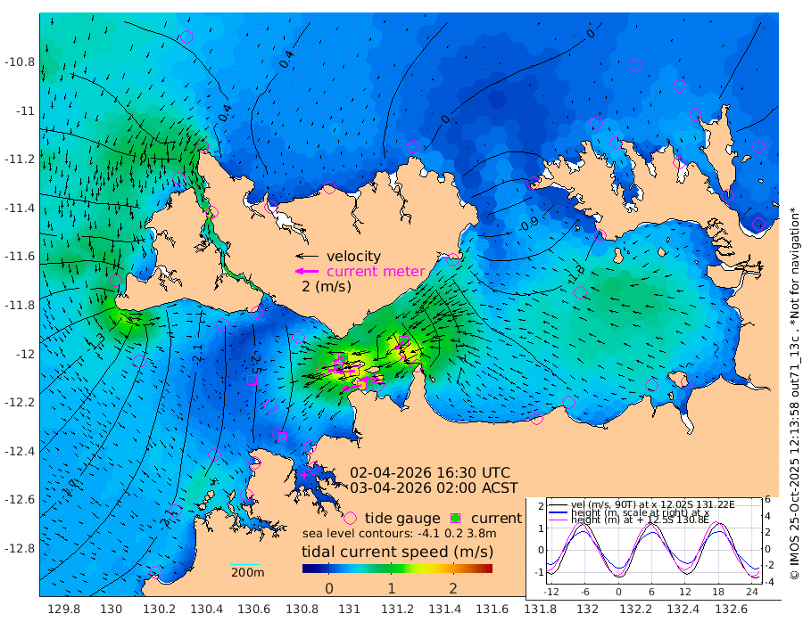 176cm/s -101T +4cm/s rms + 6cm/s 51T. Darwin_C1 52m 148cm/s -92T +4cm/s rms + 7cm/s -161T. Darwin_CW1 22m 87cm/s -106T +4cm/s rms + 8cm/s 61T. Darwin_CW2 34m 104cm/s -136T +3cm/s rms + 9cm/s 98T. Darwin_CW3 22m 158cm/s -91T +5cm/s rms + 7cm/s 88T. Darwin_C3 56m 88cm/s -116T +2cm/s rms + 9cm/s -126T. Darwin_CTbW 22m 12cm/s 147T +1cm/s rms + 1cm/s -47T. DARBGF 30m 22cm/s 152T +4cm/s rms + 3cm/s 80T. NRSDAR 19m 34cm Goodrich Bank -171cm Point Jenny -168cm Native Point -201cm Fish Reef -203cm Tapa Bay -61cm Point Fawcett (Offshore) -240cm Burge Point -188cm Munkunuwa -145cm Beagle A -237cm Parsons Bank -226cm Fenton Patches -236cm Hancox Shoal Area -240cm Nightcliff -273cm Darwin -234cm Charles Point Patches -224cm Glyde Point -211cm Chambers Bay -223cm Point Stuart -207cm Cape Hotham -193cm Christine Reef -243cm West Alligator Head -245cm East Field Island -184cm Two Hills Bay -176cm Camp Point -209cm Medina Inlet South -44cm South Barlow Point -7cm St. Asaph Bay 33cm Cape Van Dieman 23cm Snake Bay 21cm Cache Point -8cm Point Jahleel (Off) -81cm Cape Don -22cm Port Essington -19cm Smith Point - West -18cm NW Peacock Island 4cm North Of Jones Shoal -1cm Peacock Island -49cm Point David -24cm D'urville Point -54cm Copeland Island -49cm One Tree Point