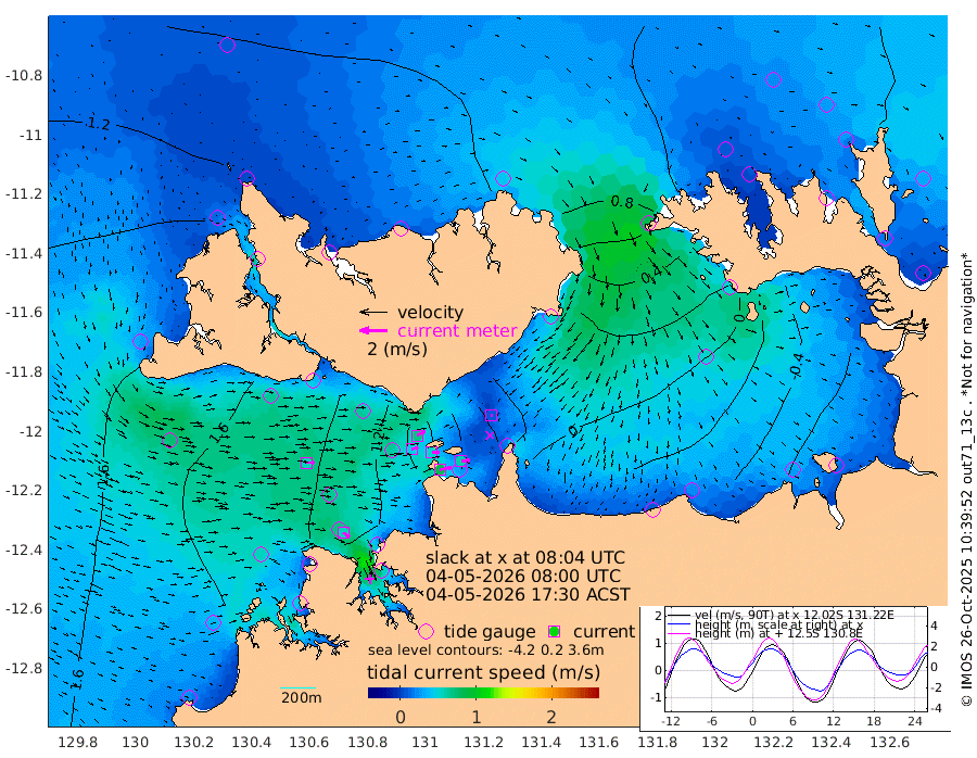 84cm/s 79T +4cm/s rms + 6cm/s 51T. Darwin_C1 52m 60cm/s 82T +4cm/s rms + 7cm/s -161T. Darwin_CW1 22m 48cm/s 75T +4cm/s rms + 8cm/s 61T. Darwin_CW2 34m 11cm/s 87T +3cm/s rms + 9cm/s 98T. Darwin_CW3 22m 50cm/s 86T +5cm/s rms + 7cm/s 88T. Darwin_C3 56m 68cm/s 62T +2cm/s rms + 9cm/s -126T. Darwin_CTbW 22m 56cm/s 91T +1cm/s rms + 1cm/s -47T. DARBGF 30m 54cm/s 121T +4cm/s rms + 3cm/s 80T. NRSDAR 19m 76cm Goodrich Bank 134cm Point Jenny 137cm Native Point 133cm Fish Reef 142cm Tapa Bay 118cm Point Fawcett (Offshore) 142cm Burge Point 142cm Munkunuwa 132cm Beagle A 137cm Parsons Bank 137cm Fenton Patches 121cm Hancox Shoal Area 140cm Nightcliff 141cm Darwin 147cm Charles Point Patches 61cm Glyde Point -27cm Chambers Bay -48cm Point Stuart 28cm Cape Hotham -20cm Christine Reef -66cm West Alligator Head -101cm East Field Island -4cm Two Hills Bay 10cm Camp Point 143cm Medina Inlet South 124cm South Barlow Point 104cm St. Asaph Bay 84cm Cape Van Dieman 93cm Snake Bay 75cm Cache Point 70cm Point Jahleel (Off) 63cm Cape Don 76cm Port Essington 76cm Smith Point - West 74cm NW Peacock Island 73cm North Of Jones Shoal 27cm Peacock Island 76cm Point David 80cm D'urville Point 72cm Copeland Island 75cm One Tree Point