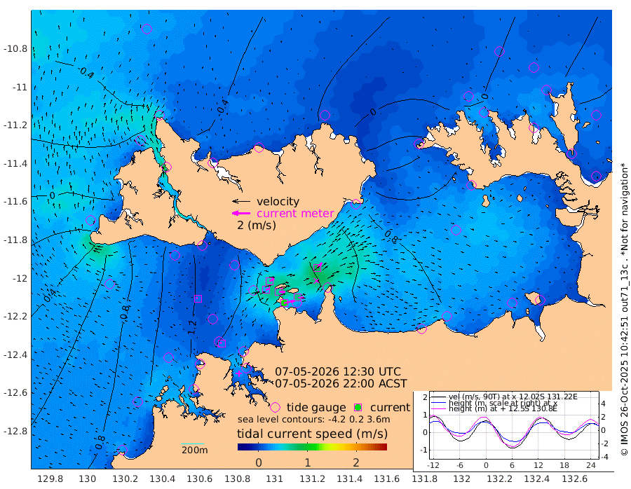 119cm/s 78T +4cm/s rms + 6cm/s 51T. Darwin_C1 52m 70cm/s 91T +4cm/s rms + 7cm/s -161T. Darwin_CW1 22m 38cm/s 73T +4cm/s rms + 8cm/s 61T. Darwin_CW2 34m 78cm/s 42T +3cm/s rms + 9cm/s 98T. Darwin_CW3 22m 66cm/s 90T +5cm/s rms + 7cm/s 88T. Darwin_C3 56m 59cm/s 66T +2cm/s rms + 9cm/s -126T. Darwin_CTbW 22m 12cm/s -76T +1cm/s rms + 1cm/s -47T. DARBGF 30m 17cm/s -36T +4cm/s rms + 3cm/s 80T. NRSDAR 19m -51cm Goodrich Bank 25cm Point Jenny 23cm Native Point 31cm Fish Reef 48cm Tapa Bay -23cm Point Fawcett (Offshore) 47cm Burge Point 38cm Munkunuwa -2cm Beagle A 72cm Parsons Bank 40cm Fenton Patches 79cm Hancox Shoal Area 73cm Nightcliff 82cm Darwin 57cm Charles Point Patches 73cm Glyde Point 83cm Chambers Bay 90cm Point Stuart 76cm Cape Hotham 70cm Christine Reef 99cm West Alligator Head 98cm East Field Island 72cm Two Hills Bay 64cm Camp Point 45cm Medina Inlet South -23cm South Barlow Point -42cm St. Asaph Bay -49cm Cape Van Dieman -36cm Snake Bay -45cm Cache Point -23cm Point Jahleel (Off) 19cm Cape Don -6cm Port Essington -6cm Smith Point - West -1cm NW Peacock Island -17cm North Of Jones Shoal -2cm Peacock Island 44cm Point David 5cm D'urville Point 49cm Copeland Island 35cm One Tree Point