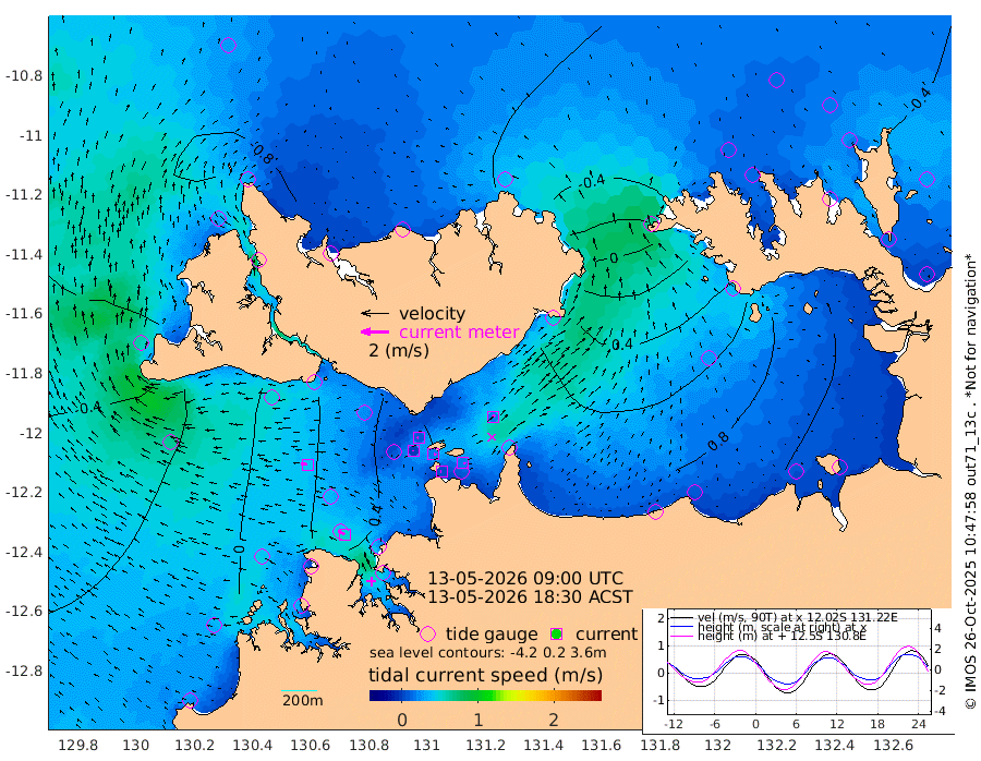 7cm/s -104T +4cm/s rms + 6cm/s 51T. Darwin_C1 52m 18cm/s 93T +4cm/s rms + 7cm/s -161T. Darwin_CW1 22m 2cm/s 9T +4cm/s rms + 8cm/s 61T. Darwin_CW2 34m 18cm/s 37T +3cm/s rms + 9cm/s 98T. Darwin_CW3 22m 17cm/s 94T +5cm/s rms + 7cm/s 88T. Darwin_C3 56m 10cm/s -120T +2cm/s rms + 9cm/s -126T. Darwin_CTbW 22m 43cm/s -84T +1cm/s rms + 1cm/s -47T. DARBGF 30m 50cm/s -55T +4cm/s rms + 3cm/s 80T. NRSDAR 19m -68cm Goodrich Bank -39cm Point Jenny -40cm Native Point -30cm Fish Reef -28cm Tapa Bay -69cm Point Fawcett (Offshore) -12cm Burge Point -31cm Munkunuwa -52cm Beagle A -12cm Parsons Bank -20cm Fenton Patches -3cm Hancox Shoal Area -7cm Nightcliff 9cm Darwin -10cm Charles Point Patches 32cm Glyde Point 70cm Chambers Bay 85cm Point Stuart 38cm Cape Hotham 59cm Christine Reef 99cm West Alligator Head 123cm East Field Island 45cm Two Hills Bay 53cm Camp Point -20cm Medina Inlet South -68cm South Barlow Point -74cm St. Asaph Bay -73cm Cape Van Dieman -69cm Snake Bay -70cm Cache Point -55cm Point Jahleel (Off) -22cm Cape Don -49cm Port Essington -58cm Smith Point - West -54cm NW Peacock Island -55cm North Of Jones Shoal -19cm Peacock Island -35cm Point David -56cm D'urville Point -32cm Copeland Island -33cm One Tree Point
