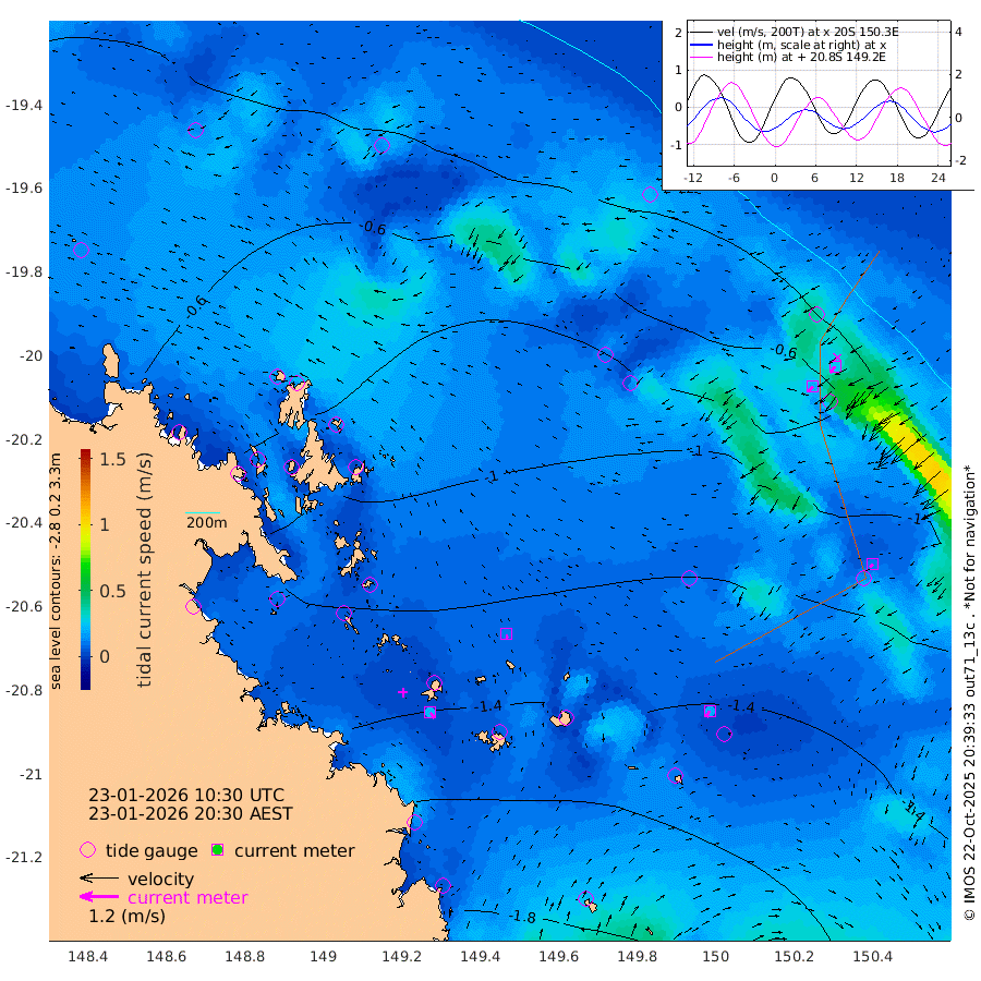22cm/s 145T +10cm/s rms + 2cm/s 5T. Brampton I 18m 12cm/s 178T +9cm/s rms + 6cm/s 66T. Wigton I 38m 20cm/s -156T +7cm/s rms + 8cm/s 141T. Tern I 47m 24cm/s -144T +7cm/s rms + 12cm/s 54T. N Bugatti Rf 64m 20cm/s -138T +3cm/s rms + 13cm/s 178T. W Bugatti Rf 70m 12cm/s -133T +3cm/s rms + 3cm/s -130T. Creal Rf 69m -60cm Holbourne I -159cm Tern I -75cm Bugatti Rf -109cm Creal Rf -51cm White Tip I -51cm Wallaby Reef -48cm Kennedy Reef -35cm Unnamed Reef No. 2 -86cm Tideway Reef -87cm Hayman Island -113cm Square Reef -79cm Double Bay -113cm Molle Island -107cm Cid Harbour -87cm Hook Island -96cm Border Island -105cm Haslewood Island -105cm Shute Harbour -135cm Thomas Island -136cm Credlin Reef -152cm East Repulse Island -151cm Blacksmith Island -161cm Laguna Quays -152cm Carlisle Island (Off) -168cm St. Bees Island -154cm Scawfell Island -172cm Penrith Island -190cm Mackay Outer Harbour -202cm Hay Point -188cm Prudhoe Island
