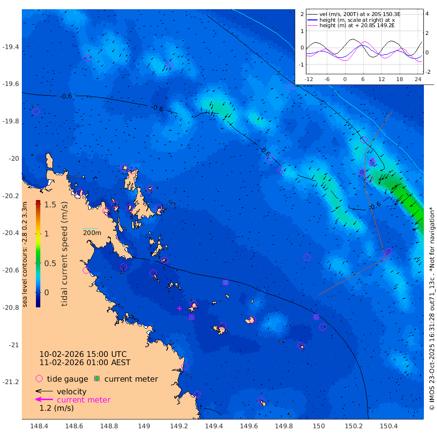 6cm/s -178T +10cm/s rms + 2cm/s 5T. Brampton I 18m 10cm/s -166T +9cm/s rms + 6cm/s 66T. Wigton I 38m 7cm/s -138T +7cm/s rms + 8cm/s 141T. Tern I 47m 9cm/s -119T +7cm/s rms + 12cm/s 54T. N Bugatti Rf 64m 5cm/s -59T +3cm/s rms + 13cm/s 178T. W Bugatti Rf 70m 4cm/s -154T +3cm/s rms + 3cm/s -130T. Creal Rf 69m -64cm Holbourne I -73cm Tern I -46cm Bugatti Rf -53cm Creal Rf -39cm White Tip I -53cm Wallaby Reef -51cm Kennedy Reef -41cm Unnamed Reef No. 2 -65cm Tideway Reef -59cm Hayman Island -73cm Square Reef -75cm Double Bay -81cm Molle Island -59cm Cid Harbour -67cm Hook Island -59cm Border Island -61cm Haslewood Island -68cm Shute Harbour -71cm Thomas Island -67cm Credlin Reef -77cm East Repulse Island -62cm Blacksmith Island -80cm Laguna Quays -74cm Carlisle Island (Off) -66cm St. Bees Island -58cm Scawfell Island -66cm Penrith Island -79cm Mackay Outer Harbour -81cm Hay Point -88cm Prudhoe Island
