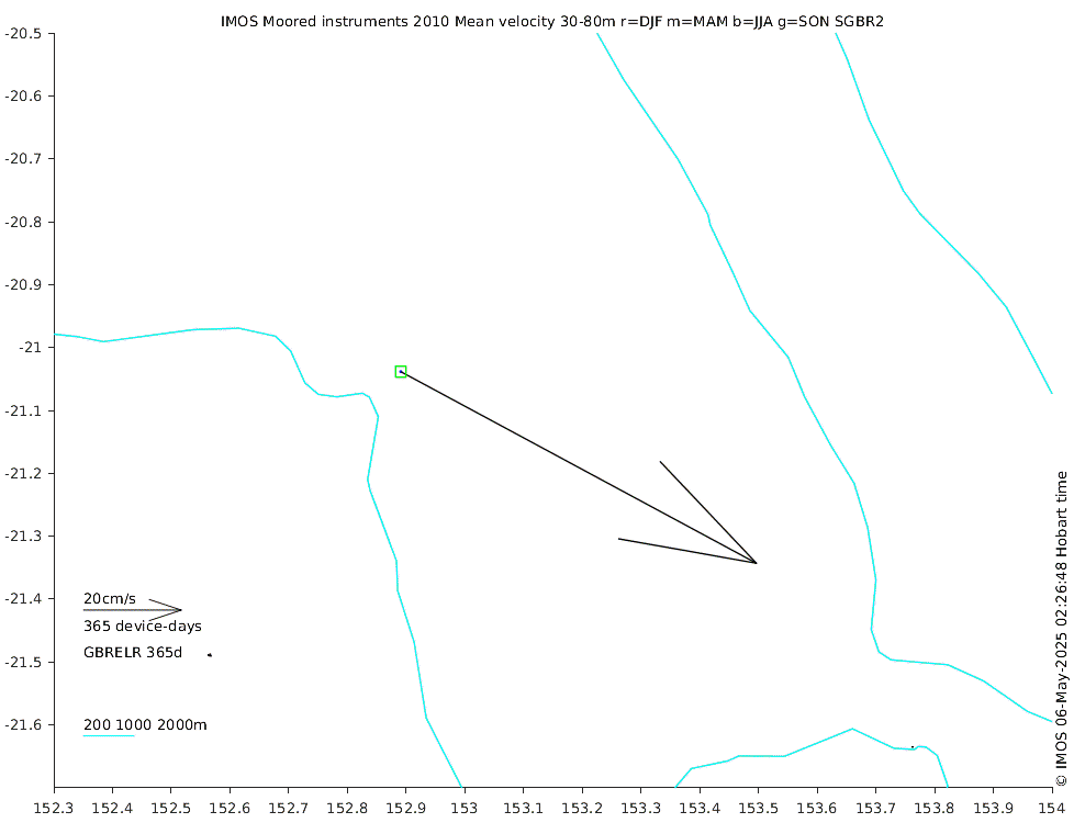 These maps show some basic analyses of the velocity data: mean (all-time in black and seasonal in colour) and sub-tidal variance for several layers and time-windows, and tidal harmonics for the depth-average velocity using the whole record. Click through to see more detailed plots of the selected dataset or to download those data from the AODN thredds server.