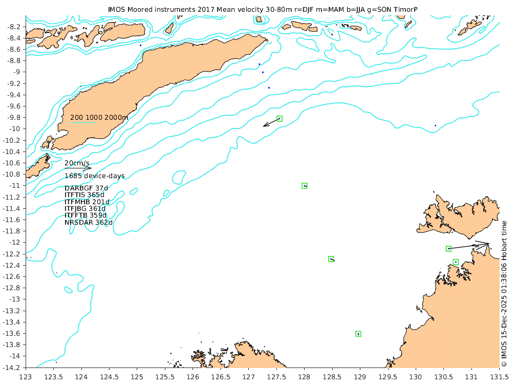 These maps show some basic analyses of the velocity data: mean (all-time in black and seasonal in colour) and sub-tidal variance for several layers and time-windows, and tidal harmonics for the depth-average velocity using the whole record. Click through to see more detailed plots of the selected dataset or to download those data from the AODN thredds server.