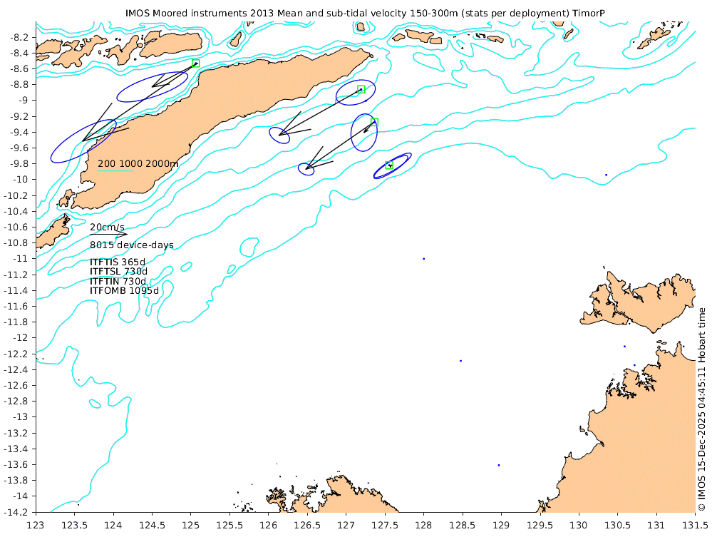 These maps show some basic analyses of the velocity data: mean (all-time in black and seasonal in colour) and sub-tidal variance for several layers and time-windows, and tidal harmonics for the depth-average velocity using the whole record. Click through to see more detailed plots of the selected dataset or to download those data from the AODN thredds server.