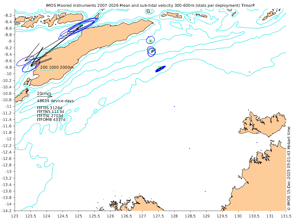 These maps show some basic analyses of the velocity data: mean (all-time in black and seasonal in colour) and sub-tidal variance for several layers and time-windows, and tidal harmonics for the depth-average velocity using the whole record. Click through to see more detailed plots of the selected dataset or to download those data from the AODN thredds server.