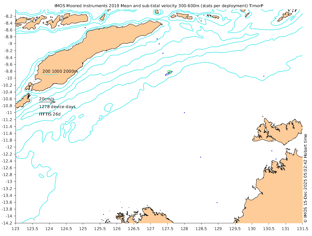 These maps show some basic analyses of the velocity data: mean (all-time in black and seasonal in colour) and sub-tidal variance for several layers and time-windows, and tidal harmonics for the depth-average velocity using the whole record. Click through to see more detailed plots of the selected dataset or to download those data from the AODN thredds server.
