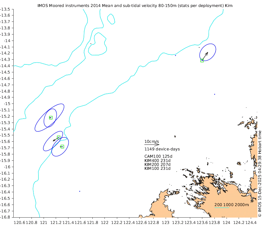 These maps show some basic analyses of the velocity data: mean (all-time in black and seasonal in colour) and sub-tidal variance for several layers and time-windows, and tidal harmonics for the depth-average velocity using the whole record. Click through to see more detailed plots of the selected dataset or to download those data from the AODN thredds server.