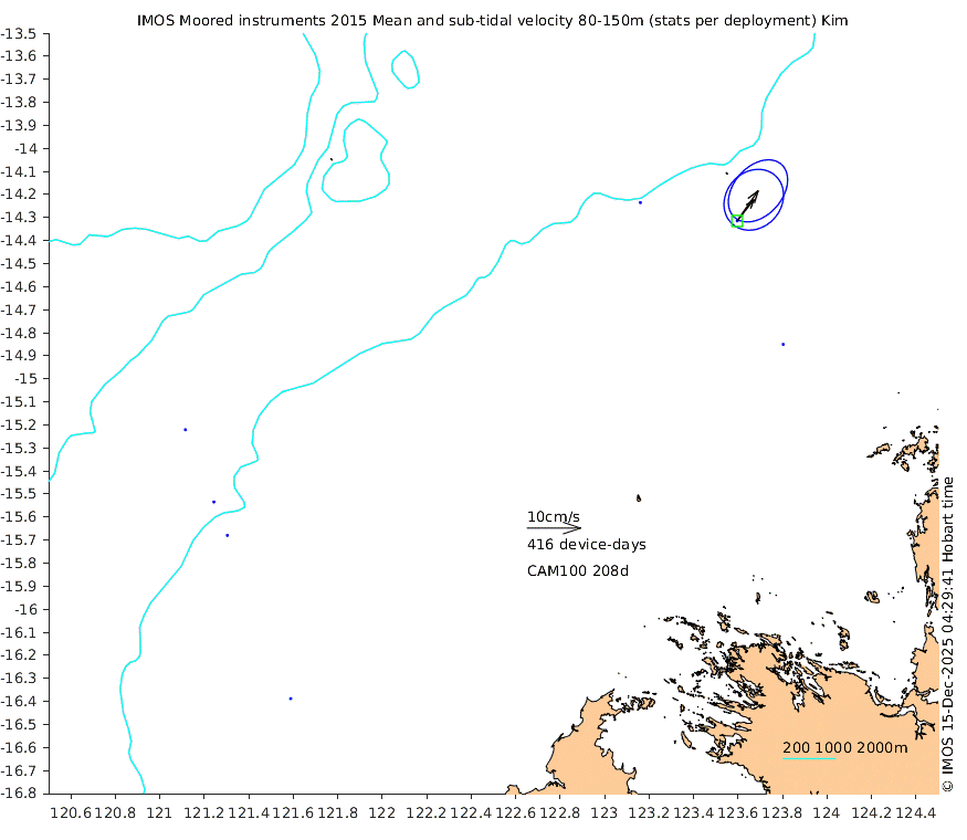 These maps show some basic analyses of the velocity data: mean (all-time in black and seasonal in colour) and sub-tidal variance for several layers and time-windows, and tidal harmonics for the depth-average velocity using the whole record. Click through to see more detailed plots of the selected dataset or to download those data from the AODN thredds server.