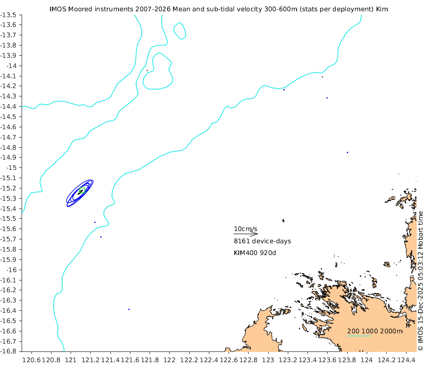 These maps show some basic analyses of the velocity data: mean (all-time in black and seasonal in colour) and sub-tidal variance for several layers and time-windows, and tidal harmonics for the depth-average velocity using the whole record. Click through to see more detailed plots of the selected dataset or to download those data from the AODN thredds server.