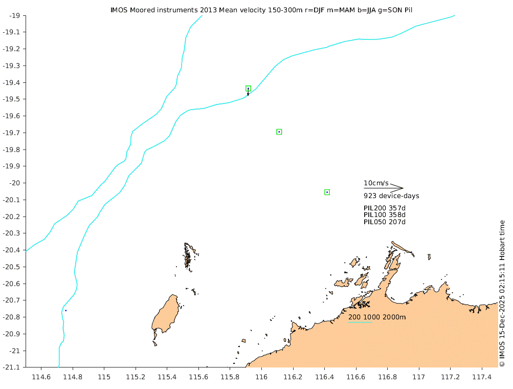 These maps show some basic analyses of the velocity data: mean (all-time in black and seasonal in colour) and sub-tidal variance for several layers and time-windows, and tidal harmonics for the depth-average velocity using the whole record. Click through to see more detailed plots of the selected dataset or to download those data from the AODN thredds server.