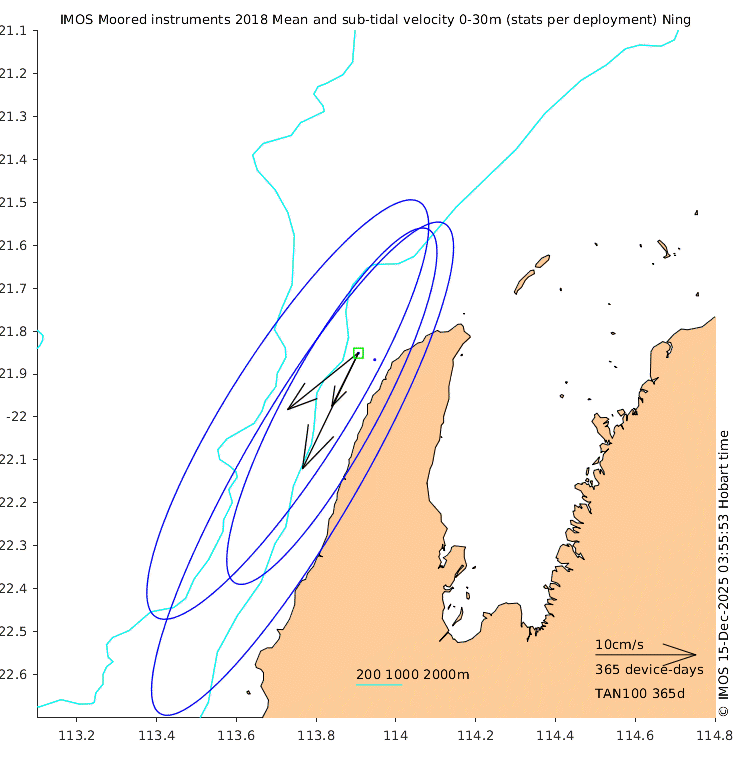 These maps show some basic analyses of the velocity data: mean (all-time in black and seasonal in colour) and sub-tidal variance for several layers and time-windows, and tidal harmonics for the depth-average velocity using the whole record. Click through to see more detailed plots of the selected dataset or to download those data from the AODN thredds server.