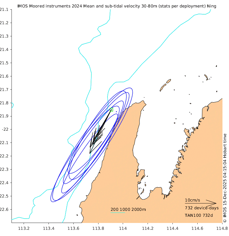 These maps show some basic analyses of the velocity data: mean (all-time in black and seasonal in colour) and sub-tidal variance for several layers and time-windows, and tidal harmonics for the depth-average velocity using the whole record. Click through to see more detailed plots of the selected dataset or to download those data from the AODN thredds server.