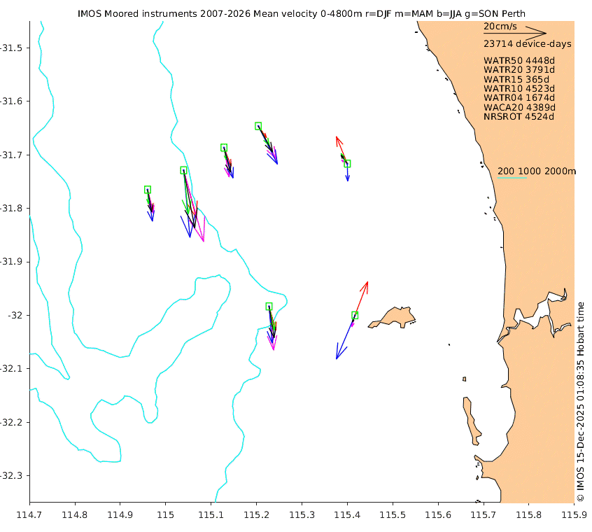 These maps show some basic analyses of the velocity data: mean (all-time in black and seasonal in colour) and sub-tidal variance for several layers and time-windows, and tidal harmonics for the depth-average velocity using the whole record. Click through to see more detailed plots of the selected dataset or to download those data from the AODN thredds server.
