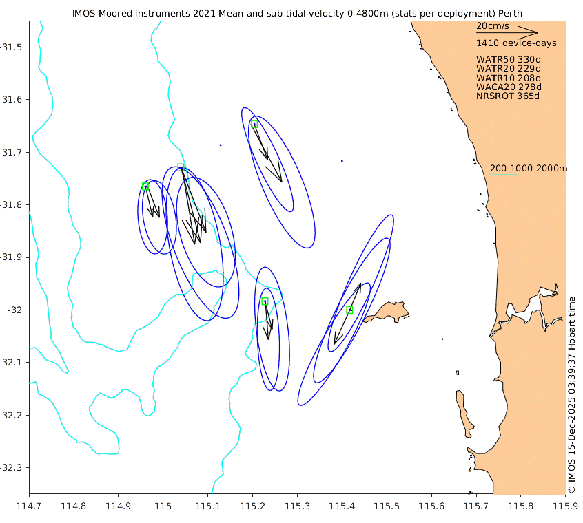 These maps show some basic analyses of the velocity data: mean (all-time in black and seasonal in colour) and sub-tidal variance for several layers and time-windows, and tidal harmonics for the depth-average velocity using the whole record. Click through to see more detailed plots of the selected dataset or to download those data from the AODN thredds server.