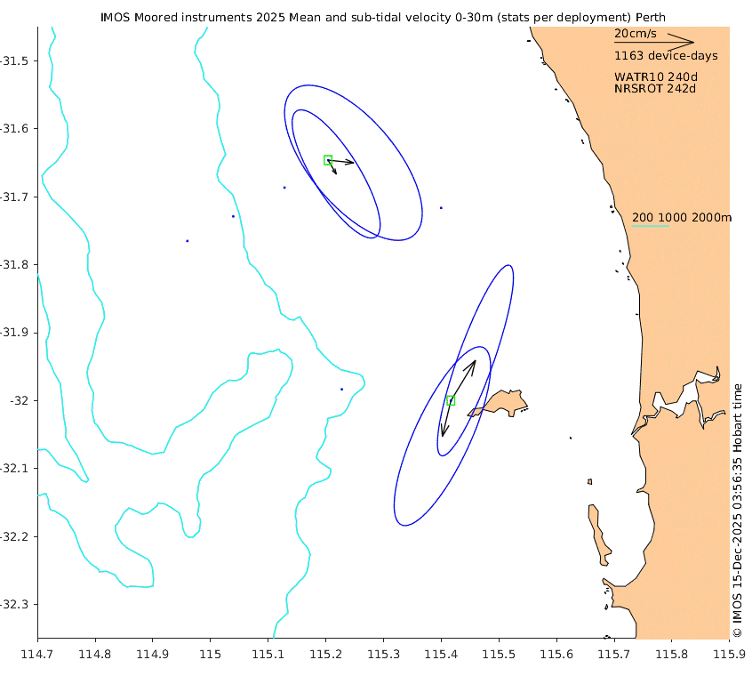 These maps show some basic analyses of the velocity data: mean (all-time in black and seasonal in colour) and sub-tidal variance for several layers and time-windows, and tidal harmonics for the depth-average velocity using the whole record. Click through to see more detailed plots of the selected dataset or to download those data from the AODN thredds server.