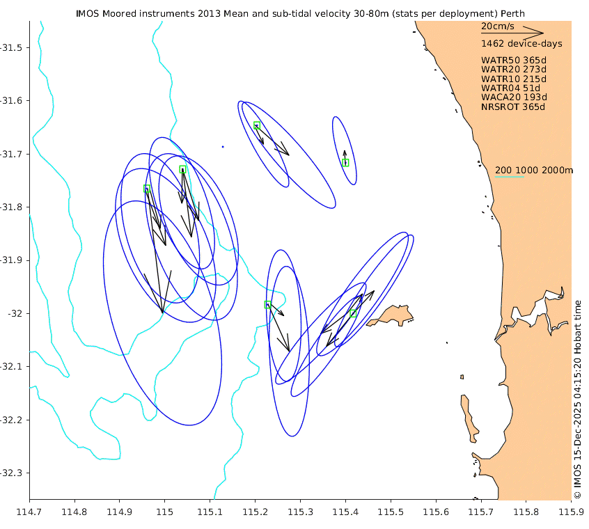 These maps show some basic analyses of the velocity data: mean (all-time in black and seasonal in colour) and sub-tidal variance for several layers and time-windows, and tidal harmonics for the depth-average velocity using the whole record. Click through to see more detailed plots of the selected dataset or to download those data from the AODN thredds server.