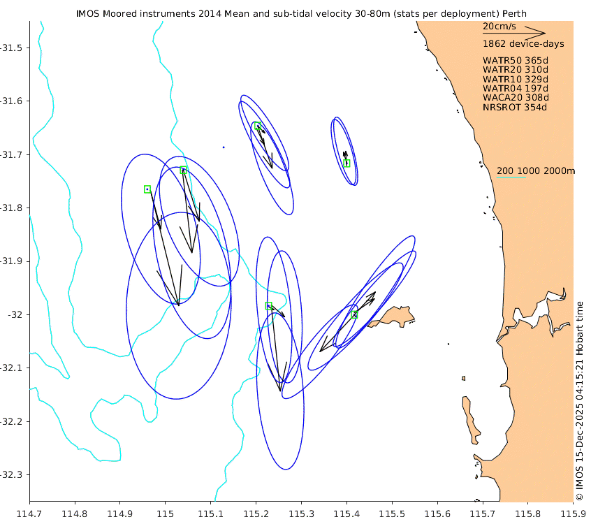 These maps show some basic analyses of the velocity data: mean (all-time in black and seasonal in colour) and sub-tidal variance for several layers and time-windows, and tidal harmonics for the depth-average velocity using the whole record. Click through to see more detailed plots of the selected dataset or to download those data from the AODN thredds server.