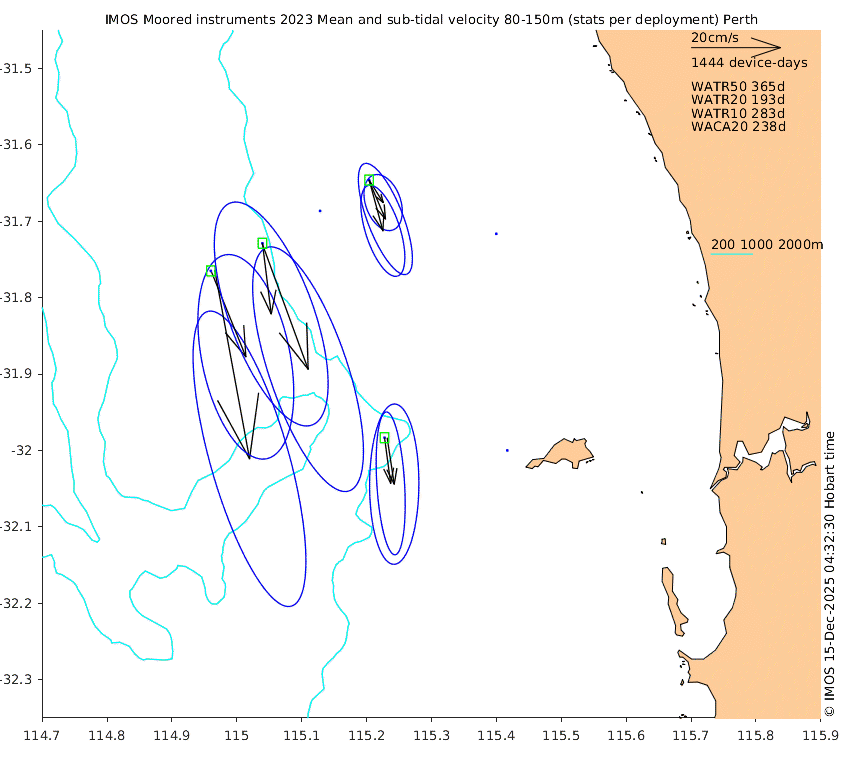 These maps show some basic analyses of the velocity data: mean (all-time in black and seasonal in colour) and sub-tidal variance for several layers and time-windows, and tidal harmonics for the depth-average velocity using the whole record. Click through to see more detailed plots of the selected dataset or to download those data from the AODN thredds server.