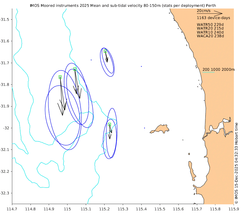 These maps show some basic analyses of the velocity data: mean (all-time in black and seasonal in colour) and sub-tidal variance for several layers and time-windows, and tidal harmonics for the depth-average velocity using the whole record. Click through to see more detailed plots of the selected dataset or to download those data from the AODN thredds server.