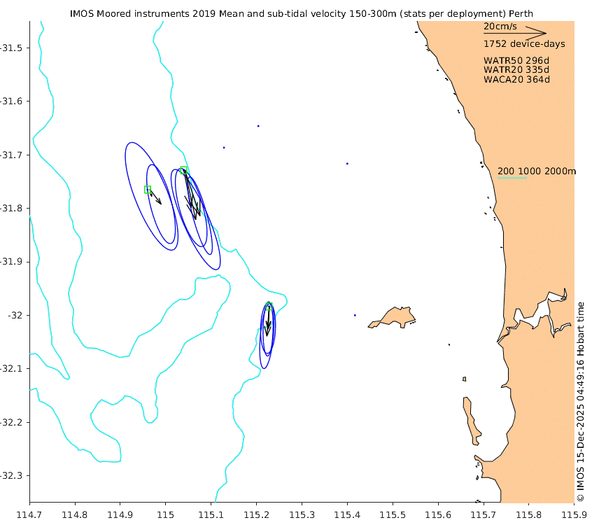These maps show some basic analyses of the velocity data: mean (all-time in black and seasonal in colour) and sub-tidal variance for several layers and time-windows, and tidal harmonics for the depth-average velocity using the whole record. Click through to see more detailed plots of the selected dataset or to download those data from the AODN thredds server.