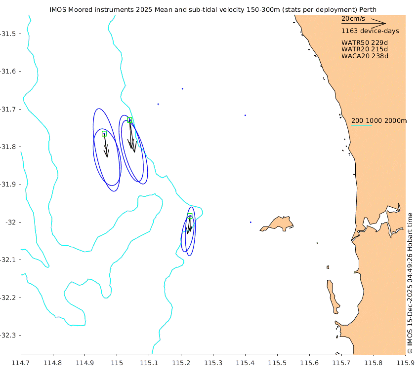 These maps show some basic analyses of the velocity data: mean (all-time in black and seasonal in colour) and sub-tidal variance for several layers and time-windows, and tidal harmonics for the depth-average velocity using the whole record. Click through to see more detailed plots of the selected dataset or to download those data from the AODN thredds server.