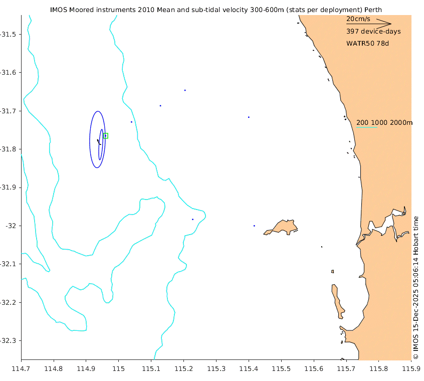 These maps show some basic analyses of the velocity data: mean (all-time in black and seasonal in colour) and sub-tidal variance for several layers and time-windows, and tidal harmonics for the depth-average velocity using the whole record. Click through to see more detailed plots of the selected dataset or to download those data from the AODN thredds server.