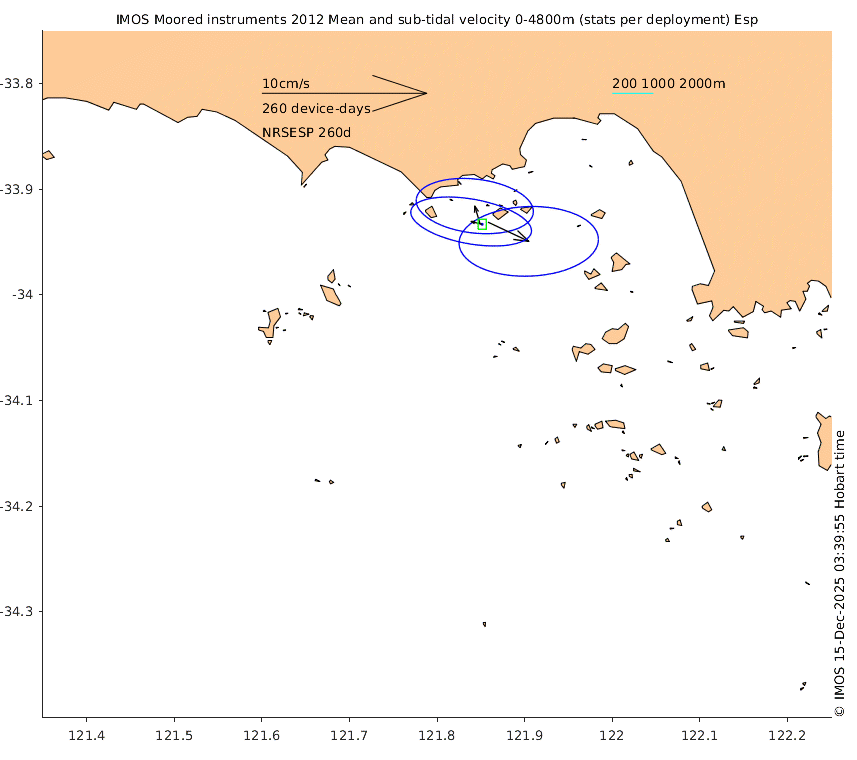 These maps show some basic analyses of the velocity data: mean (all-time in black and seasonal in colour) and sub-tidal variance for several layers and time-windows, and tidal harmonics for the depth-average velocity using the whole record. Click through to see more detailed plots of the selected dataset or to download those data from the AODN thredds server.