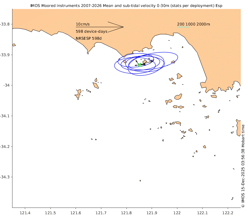 These maps show some basic analyses of the velocity data: mean (all-time in black and seasonal in colour) and sub-tidal variance for several layers and time-windows, and tidal harmonics for the depth-average velocity using the whole record. Click through to see more detailed plots of the selected dataset or to download those data from the AODN thredds server.