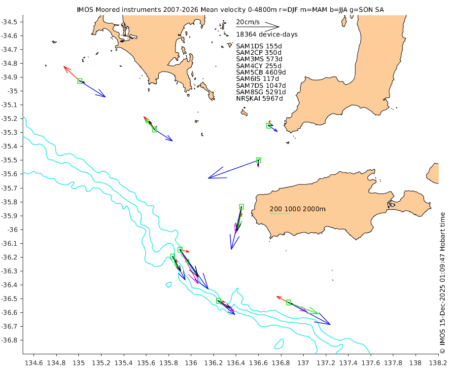 These maps show some basic analyses of the velocity data: mean (all-time in black and seasonal in colour) and sub-tidal variance for several layers and time-windows, and tidal harmonics for the depth-average velocity using the whole record. Click through to see more detailed plots of the selected dataset or to download those data from the AODN thredds server.