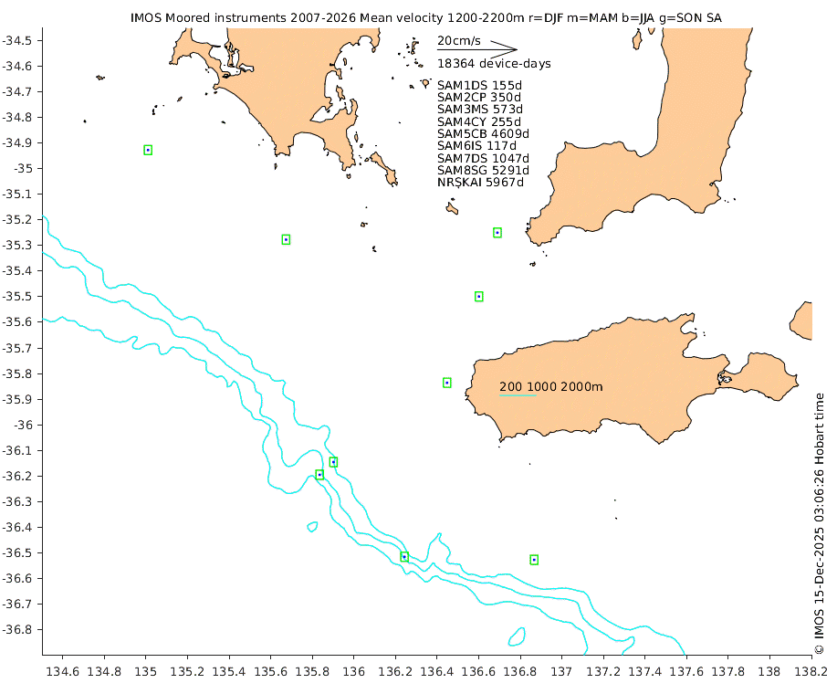 These maps show some basic analyses of the velocity data: mean (all-time in black and seasonal in colour) and sub-tidal variance for several layers and time-windows, and tidal harmonics for the depth-average velocity using the whole record. Click through to see more detailed plots of the selected dataset or to download those data from the AODN thredds server.
