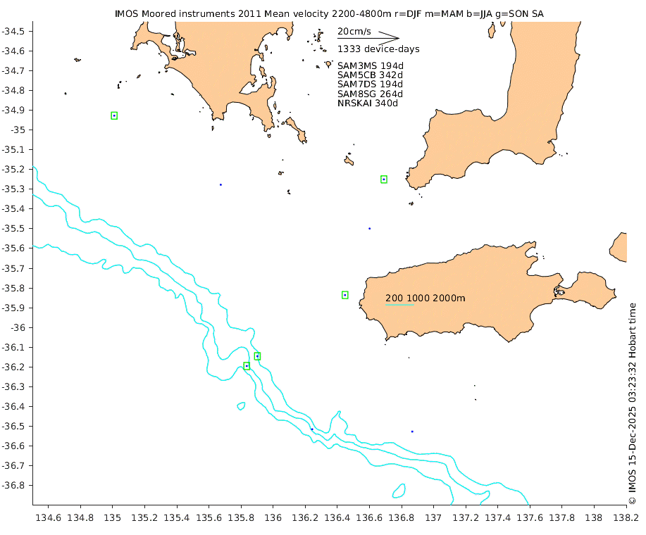 These maps show some basic analyses of the velocity data: mean (all-time in black and seasonal in colour) and sub-tidal variance for several layers and time-windows, and tidal harmonics for the depth-average velocity using the whole record. Click through to see more detailed plots of the selected dataset or to download those data from the AODN thredds server.