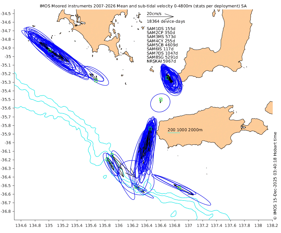 These maps show some basic analyses of the velocity data: mean (all-time in black and seasonal in colour) and sub-tidal variance for several layers and time-windows, and tidal harmonics for the depth-average velocity using the whole record. Click through to see more detailed plots of the selected dataset or to download those data from the AODN thredds server.